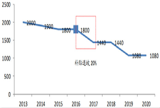 2013 到 2020 年純電動商用車補貼退坡(單位:元/kwh)