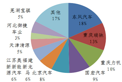 預計 8 月份新能源專用車有望進入補貼目錄,產量爆發在即。5 月 24 日工信部公布《道路機動車輛生產企業及產品公告》(第 285 批),公告包括了 218 款新能源車。此次車型公告中最受關注的是 103 款電動專用車,占新能源車型總數比為 47%,而電動專用車中,電動物流車占比 80%以上。2016 年 6 月 23 日工信部公示《道路機動車輛生產企業及產品公告》(第 286 批),包括了 396 款新能源車型,其中新能源專用車155 款。因此,預計 8、9 月份第四批《新能源汽車推廣應用推薦車型目錄》將出現新能源專用車車型。從 2016 年年初至今,多家電動物流車公司訂單數已經超過 10.32萬輛,一旦新能源物流車進入補貼目錄,電動物流車將爆發增長。其中,東風汽車在純電動汽車車型申報、市場占有率及訂單數量均遙遙領先。