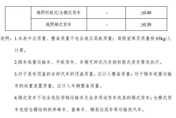 對載質(zhì)量系數(shù)的要求中包含很多專用車型,其中隨車起重運(yùn)輸車、平板貨車、車廂可卸式汽車按欄板式貨車要求執(zhí)行;對于裝有頂蓋的自卸汽車的頂蓋質(zhì)量,應(yīng)計(jì)入整備質(zhì)量,對于隨車起重運(yùn)輸車的起重裝置質(zhì)量,應(yīng)計(jì)入車輛整備質(zhì)量;廂式貨車不包含貨物運(yùn)輸車及由多用途貨車改裝的廂式貨車,倉柵式貨車包括倉柵結(jié)構(gòu)的養(yǎng)蜂車、畜禽車、桶裝垃圾車等運(yùn)輸類汽車。
