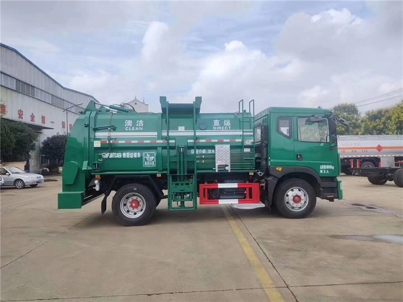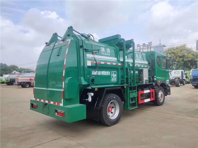 方罐式餐廚垃圾車:弧形廂體,箱體內(nèi)可實現(xiàn)固液分離,推鏟卸料,后蓋液壓開啟/鎖緊(帶耐磨橡膠密封條密封-后門關(guān)閉后滴水不漏),后門液壓鎖緊防誤操作功能,掛桶式提升機,可配合120升、240升標(biāo)準(zhǔn)垃圾桶使用,清洗裝置(帶水箱、液壓馬達(dá)帶動高壓泵)。