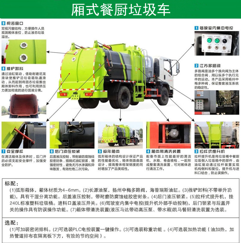 功能配置:箱體液壓舉升卸料,后蓋液壓打開(kāi)和鎖緊(帶耐磨防腐蝕硅膠密封條密封-后門(mén)關(guān)閉后滴水不漏),后蓋液壓雙重鎖緊裝置,掛桶式提升機(jī),可配合120升、240升標(biāo)準(zhǔn)垃圾桶使用。