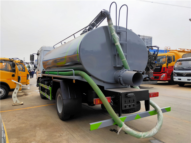 吸糞車專用部分由取力器、傳動(dòng)軸、真空吸污泵、油水分離器、水氣分離器、防溢閥、壓力罐體、液壓部分,管網(wǎng)系統(tǒng)、吸污導(dǎo)管、自流閥、真空壓力表、視糞窗、洗手裝置等組成。罐體采用Q235碳鋼板制作,罐體封頭一次壓鑄成型,吸污導(dǎo)管可自吸自排,隨車配置大功率真空吸污泵。