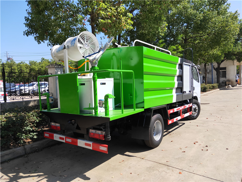 灑水車工作主要由發動機帶動變速箱,變速箱上安裝的取力器帶動灑水車水泵產生動力,將罐體內部的水通過管路噴灑出去,水泵可自吸自排。可根據用戶需求選配抑塵霧炮。